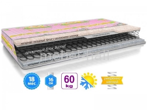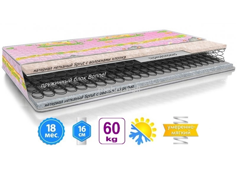 БАЛУ - детский пружинный матрас на основе классического блока пружин «Вonnell» уменьшенной высоты. Настилы из материала «Sprut» - гарантия прекрасной воздухопроницаемости. Добавки волокон хлопка и шерсти обеспечивают эффект «Зима-Лето», поэтому поверхность матраца всегда будет комфортной.