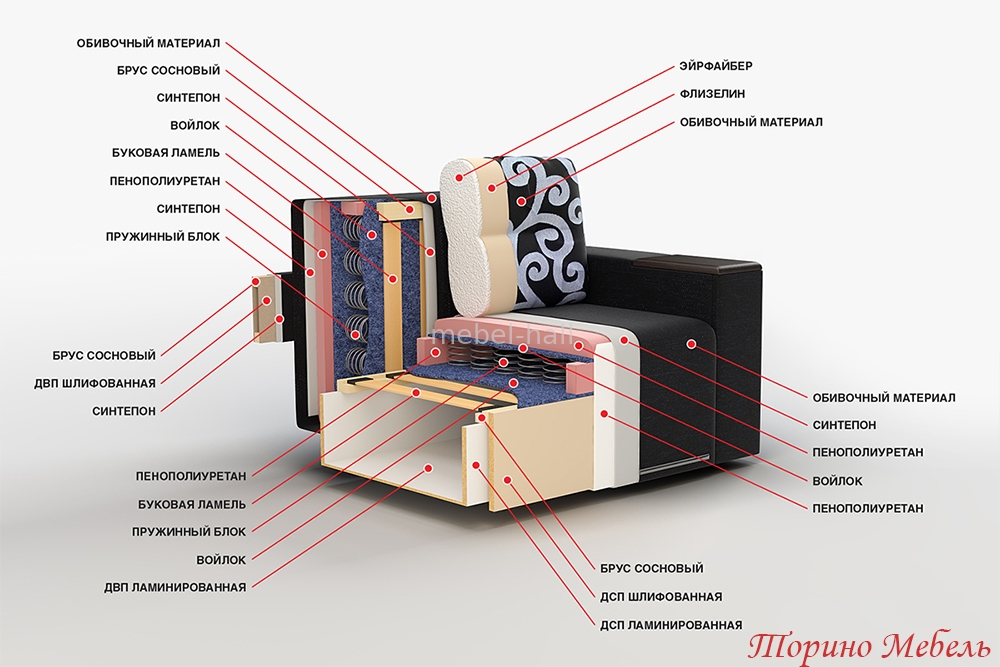 | Наполнение дивана: | Пружины - Бонель - ППУ - Войлок |