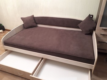 Кровать-диван ВАДИМ АНГЕЛ изготовлен из ламинированного ДСП толщиной 16 мм. В выдвижных ящиках используется телескопическая система. Кровать обита качественным велюром ANGEL. Матрас является ортопедическим и в сочетании с грамотно сконструированным каркасом способствует не только комфортабельному отдыху, но и поддержанию физического здоровья позвоночника в процессе сна.