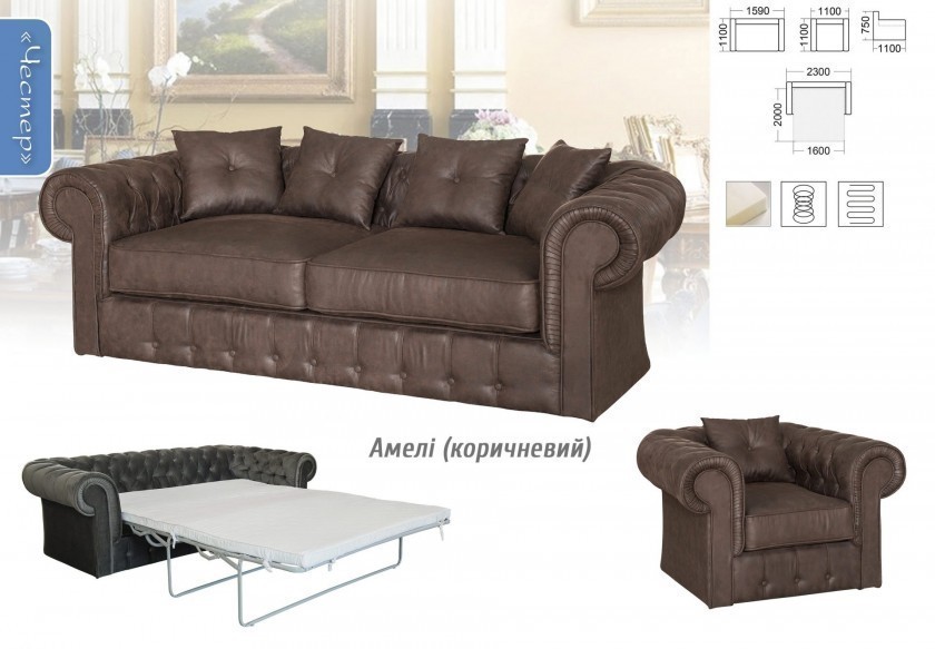 | Честер 2ка нерозкладний | Амелі коричневий | 750/1590/1100 | 8330 | 54 |