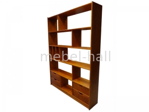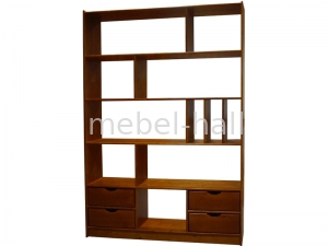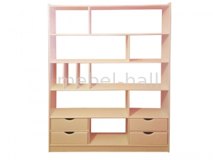 Этажерка имеет 5 открытых полок одинаковой высоты и 4 выдвижных ящика.