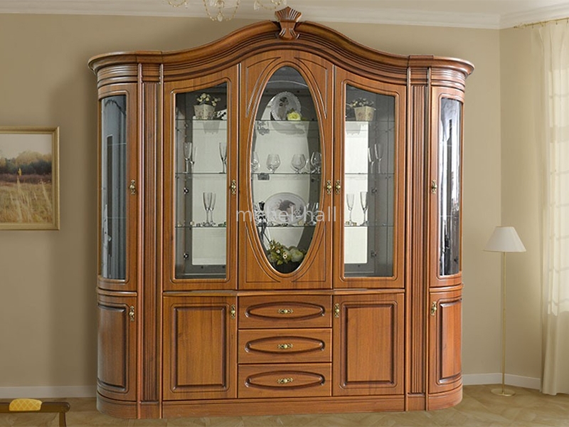 - Функционально стенка разделена на два элемента, нижний - закрытый, и верхний со стеклянными дверцами, который может выступаль в роли витрины