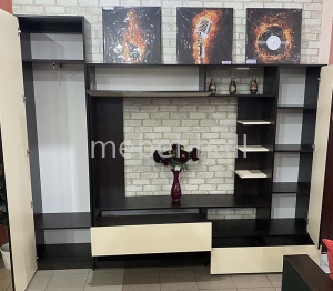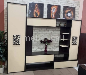 Компактные размеры гостиной, место под ТВ, множества полок, 2 выдвижных ящика, шкаф с вешалкой для тремплей позволят разместить ее в небольшой комнате.