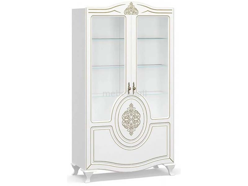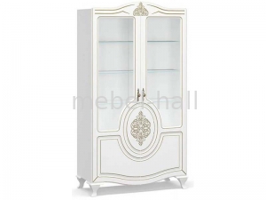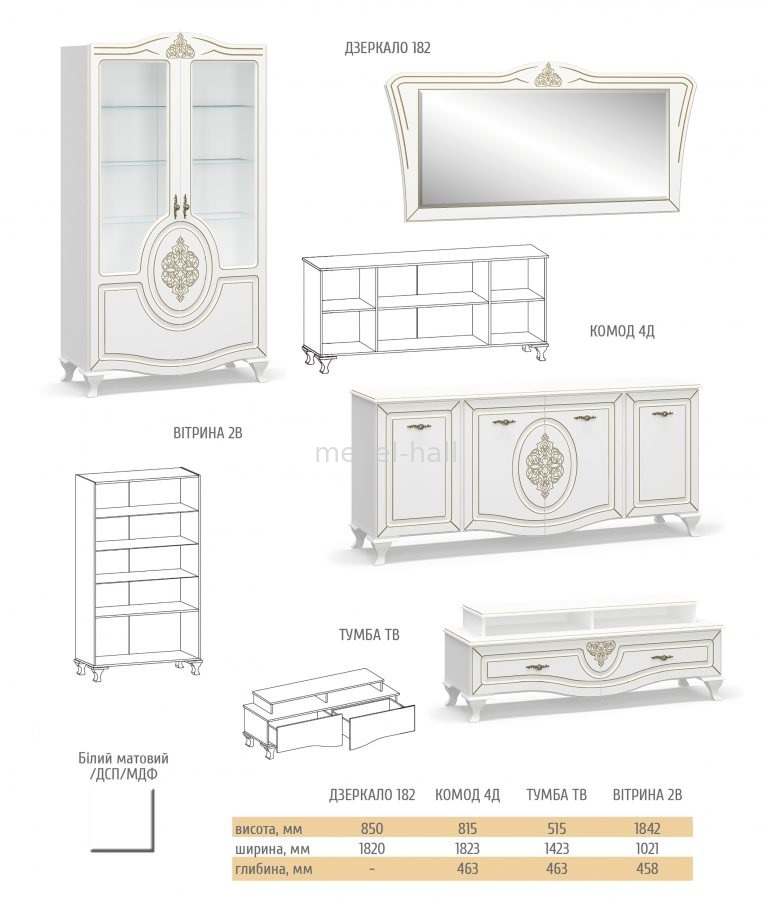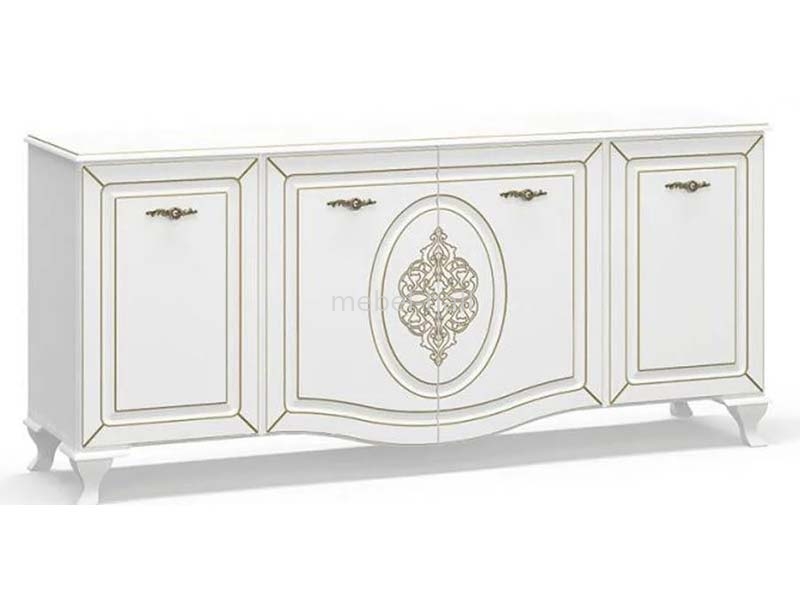 Все фасады элементов гостиной Милан выполнены из МДФ в Белом цвете с применением технологии патинирования золотом.