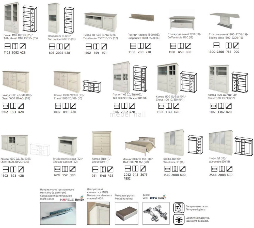 Мебель Орегон включает в себя большое количество идеально гармонирующих друг с другом модулей для создания идеального интерьера гостиной, спальни, прихожей или детской.