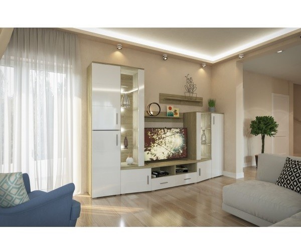 Комплект гостиной включает в себя: полку, левую витрину, правую витрину и просторную тумбу для ТВ.