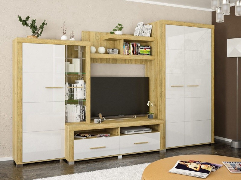 Стенка практична в использовании и несмотря на свою компактность вместительная и многофункциональная, особенно благодаря шкафу для одежды и дополнительному комоду. Гостиная Неон-2 имеет необычные глянцевые фасады, белого или черного цвета, которые делают эту модель оригинальной и запоминающейся.