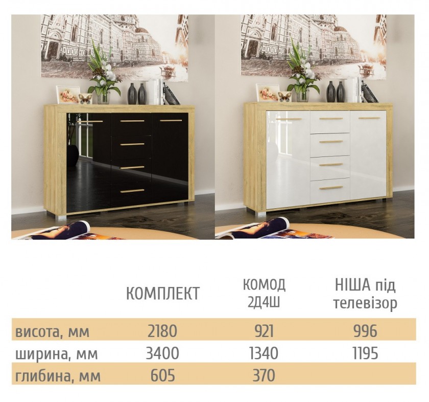 Изысканная гостиная "Неон-2" в современном стиле с дополнительным вместительным комодом, понравится любителям функциональной и одновременно красивой мебели. Имеет красивый современный дизайн модулей. Это рациональное решение для гостиной комнаты небольшого размера 12-14 кв.м.