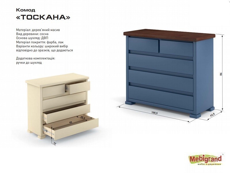 Модель Тоскана от фабрики Мебигранд выпускается с двумя небольшими верхними ящичками и тремя вместительными ящиками под ними, опирается на массивные невысокие ножки. Ящики имеют прочное дно из ДВП, оснащены телескопической системой выдвижения.