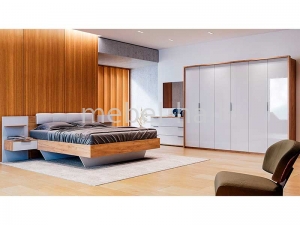 Мебель выполнена в современном стиле с сочетанием белого глянца на фасадах и древовидной текстуры дуба от украинской мебельной фабрики MiroMark. Привлекательный дизайн, новейшие тенденции, помогут оформить стильный интерьер спальной комнаты.
