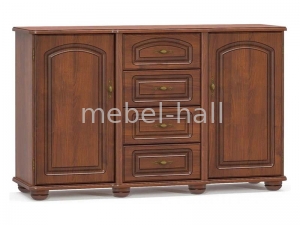 Комод 2Д4Ш Салма от украинской мебельной фабрики Мебель Сервис - современный комод для гостиной, выполнен в классическом стиле, воплощающий в себе роскошь и функциональность одновременно. Изделие изготавливается в темных тонах под натуральное дерево с эффектом патинирования. В качестве декора используются оригинальные небольшие латунные ручки и деревянные ножки, выполненные полусферой. Модель оснащена выдвижными ящиками на направляющих полного выдвижения, что гарантирует плавность при выдвижении и долговечность.