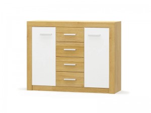 Фасад комода Квадро выполнен из ламинированного ДСП в цвете Рисинг Эльм + ламинированного ДСП в цвете Белый Глянец.