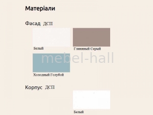 Фасад выполнен из ламинированного ДСП в цветах Белый / Глиняный Серый / Холодный Голубой.