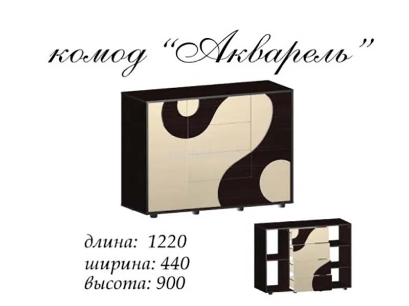 Комод "Акварель" создан в приятном сочетании темных и светлых оттенков. Изделие выполнено с применением ламинированного ДСП с МДФ накладками. Оригинальности мебели придает отсутствие ручек, из заменяют изгибы МДФ профиля. Имеет выдвижные шухляды и полки внутри для хранения Ваших вещей. Комод хорошо дополнит собой любой интерьер.