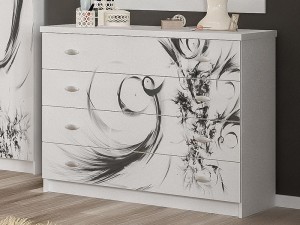 Комод Ева с четырьмя шухлядами Мебель Сервис Белый отлакированный с шелкографией от украинской фабрики "Мебель-Сервис". Современный комод с оригинальным решением фасадов. Направляющие на ящиках телескопические, что гарантирует плавность при выдвижении и долговечность. Характеризуется правильными геометрическими формами, прямыми линиями, простым и лаконичным исполнением, который создаст уют и крепкий сон в Вашей спальне.