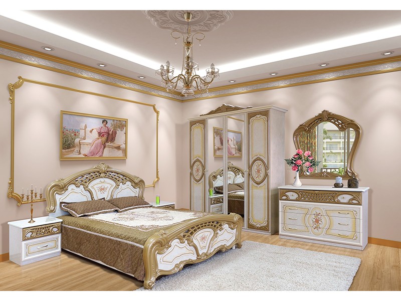Фасад отлакированный, выполнен из ламинированного ДСП в цвете Пино Беж Лак + Художественная Печать + Декоративная Резьба в Золотом цвете.