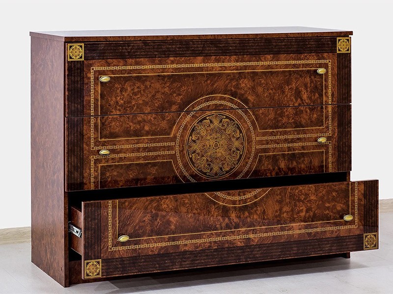 Фасад комода выполнен из ламинированного ДСП в цвете Корень (лак) + шелкография.