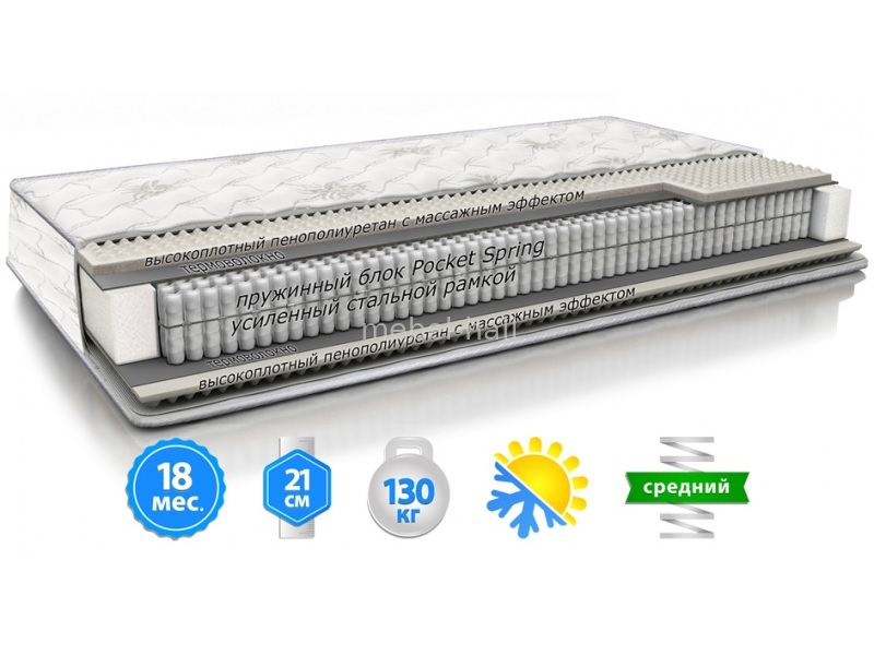 - Пружинная система "Pocket Spring" независимые пружины, которые помещаются в отдельные текстильные мешочки. Каждая пружина в таком пружинном блоке работает независимо друг от друга, что обеспечивает равномерное распределение нагрузки по поверхности матраса, а так же, идеальную поддержку позвоночника в анатомически правильном положении. Матрас с независимым пружинным блоком Pocket Spring идеально повторяет изгибы тела. По периметру расположена рама из прокатной стали, которая не дает пружинному блоку деформироваться, таким образом, она увеличивает срок его службы. Эту особенность можно считать одним из важных плюсов в сравнении с конкурентами.