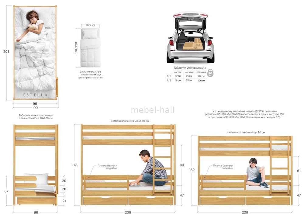| Размер спального места верхнего яруса, см: | 90 х 190, 90 х 200 |