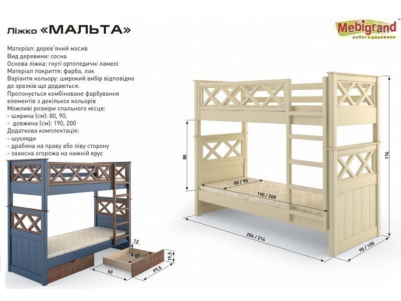 Кровать деревянная двухъярусная МАЛЬТА 90х200 МебиГранд (без шухляд)