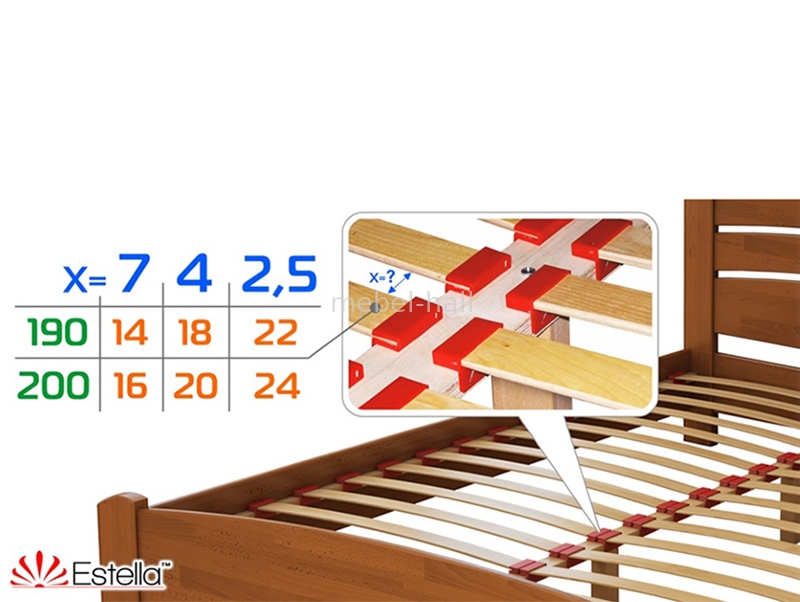 Кровать Рената комплектуется ламелями из буковой фанеры толщиной 8 мм комплект "Стандарт" расстояние между ламелями 4 см 20 шт.
