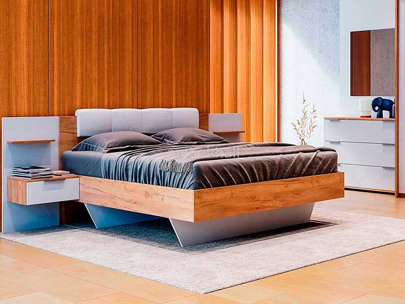 Мебель выполнена в современном стиле с сочетанием белого глянца на фасадах и древовидной текстуры дуба от украинской мебельной фабрики MiroMark. Привлекательный дизайн, новейшие тенденции, мягким изголовьем, помогут оформить стильный интерьер спальной комнаты.