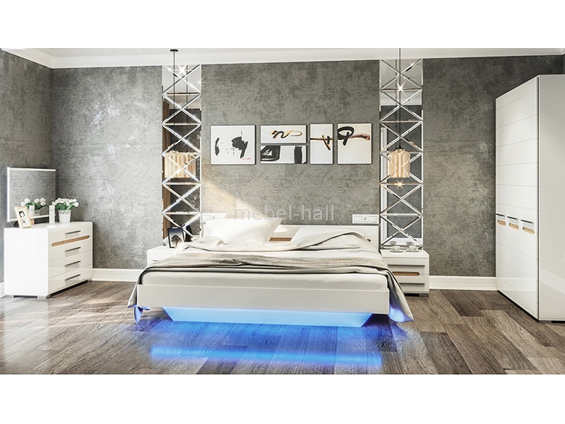 Стильная, воплощающая в себе всю красоту и сдержанность простых линий и форм. Выпускается в эффектном сочетании цветов: корпус белый, фасад белый глянец с контрастными вставками дуб сонома. Сияющие белоснежные глянцевые фасады, визуально разделенные на блоки, а также наличие голубой подсветки, зрительно расширяют пространство. Кровать БЬЯНКО украсит самый изысканный интерьер.