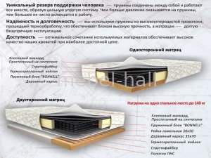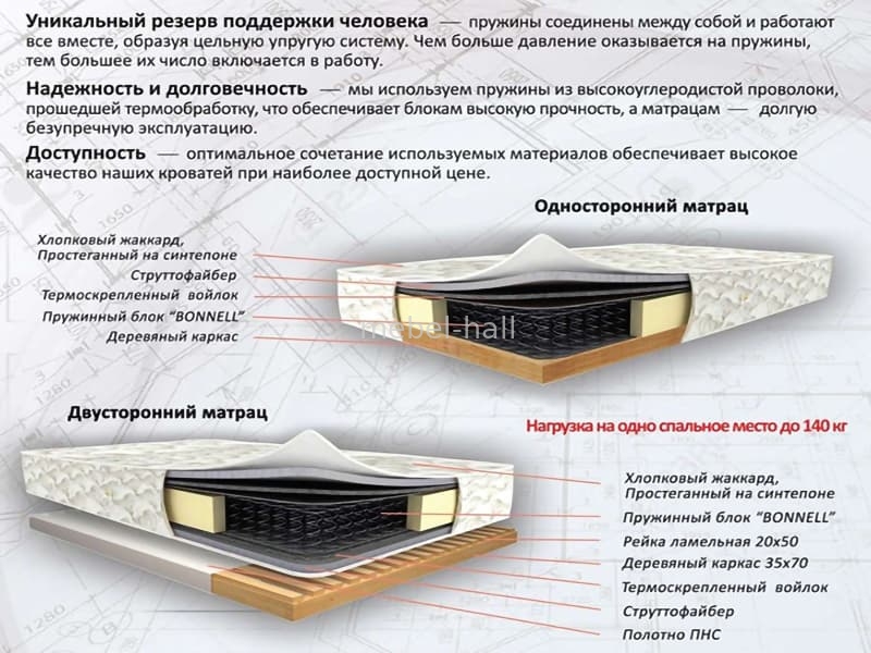 - С односторонним матрасом на деревянной основе (собственного производства из комплектующих "ВЕЛАМ"). В состав одностороннего матраса входят : пружинный блок Боннель, термоскрепленный войлок, струтофайбер, простеганный на синтепоне чехол из хлопчатобумажной ткани, деревянное основание, которое служит каркасом.