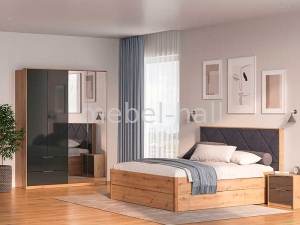 Модульная мебель для спальни Реймонд в современном стиле, сочетающая матовую серую поверхность и древовидную, от украинской мебельной фабрики MiroMark. Функциональный дизайн, качество и уют, алюминиевые профильные ручки на выдвижных ящиках, мягкое изголовьем, помогут оформить стильный интерьер спальной комнаты.