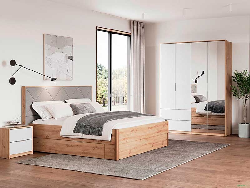 Мебель для спальни Реймонд в современном стиле, сочетающая глянцевую белую поверхность и древовидную, от украинской мебельной фабрики MiroMark. Функциональный дизайн, качество и уют, алюминиевые профильные ручки на выдвижных ящиках, мягким изголовье, помогут оформить стильный интерьер спальной комнаты.