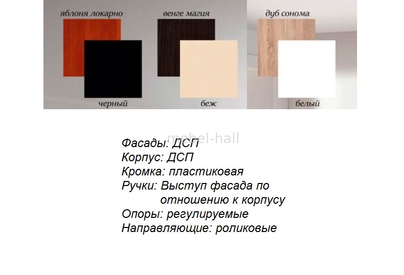Корпус и фасады системы изготовлены из качественного мебельного ламинированного ДСП в сочетании различных цветов: Венге Магия/ Беж, Дуб Сонома/Белый, Яблоня/Черный.