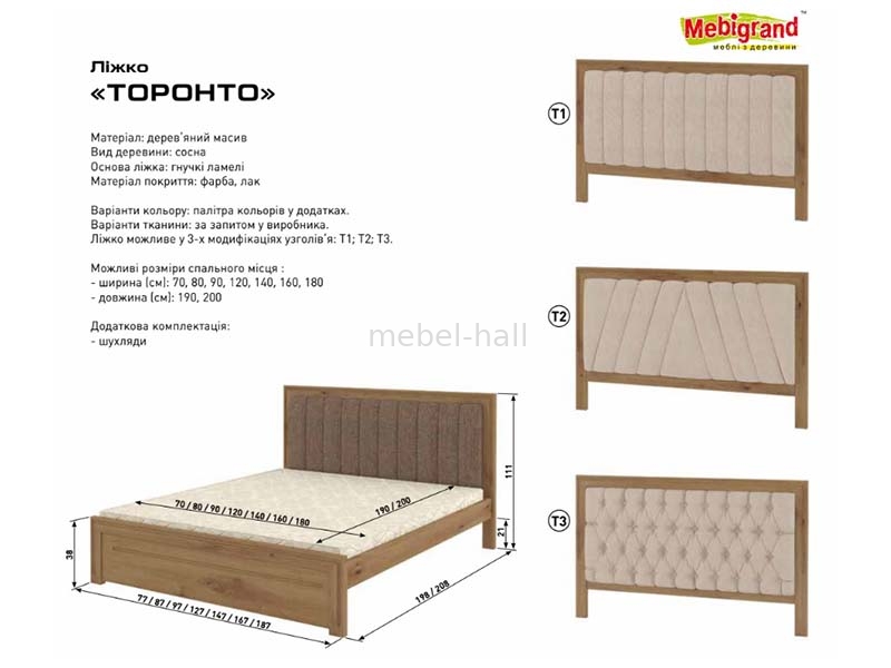Односпальная кровать из натурального дерева Торонто Мебигранд 70х200 см вариант изголовья Т1, Т2, Т3 ортопедические ламели в комплекте