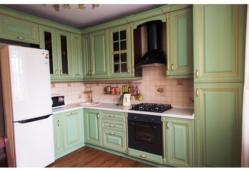 Кухни на заказ с классическими пленочными МДФ фасадами с патиной и декором