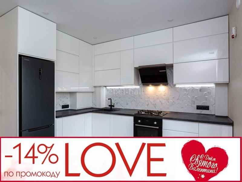 Размер белой кухни с пластиковыми фасадами без ручек под потолок на главном фото :