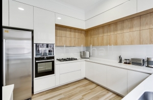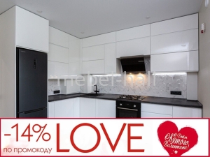 Верхние фасады на газовых амортизаторах, выдвижные ящики с доводчиками, нижние фасады тоже на петлях с доводчиками. Столешница Люксформ 38 мм.