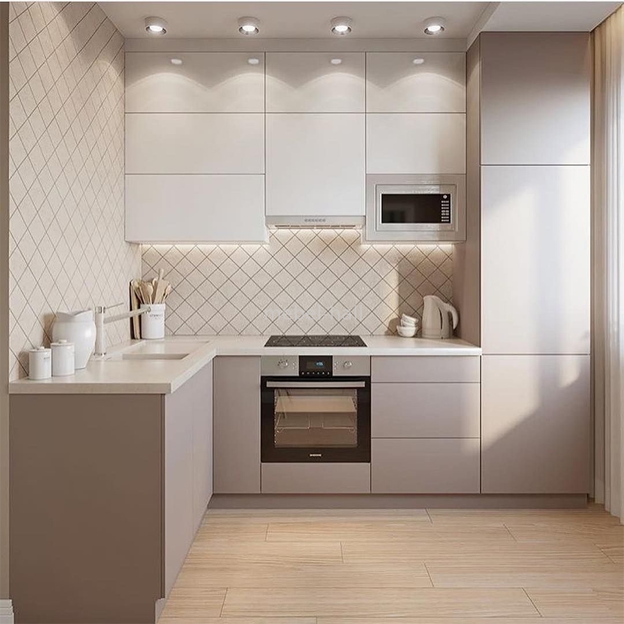 Качественная кухня под потолок в три яруса белого цвета с пластиковыми фасадами и интегрированной ручкой