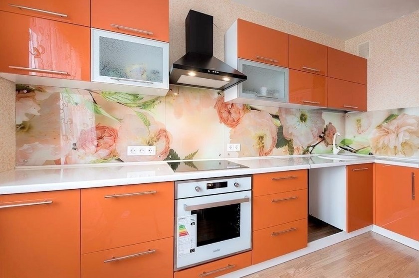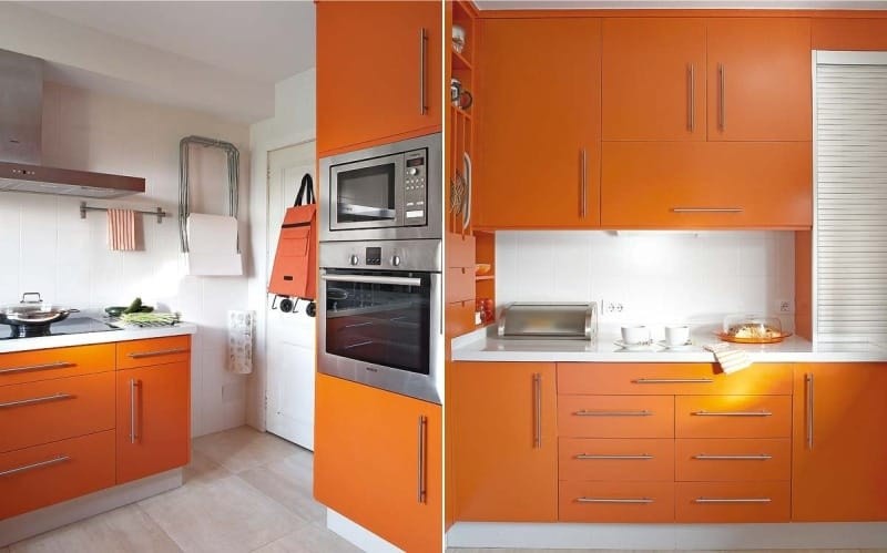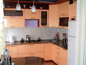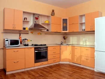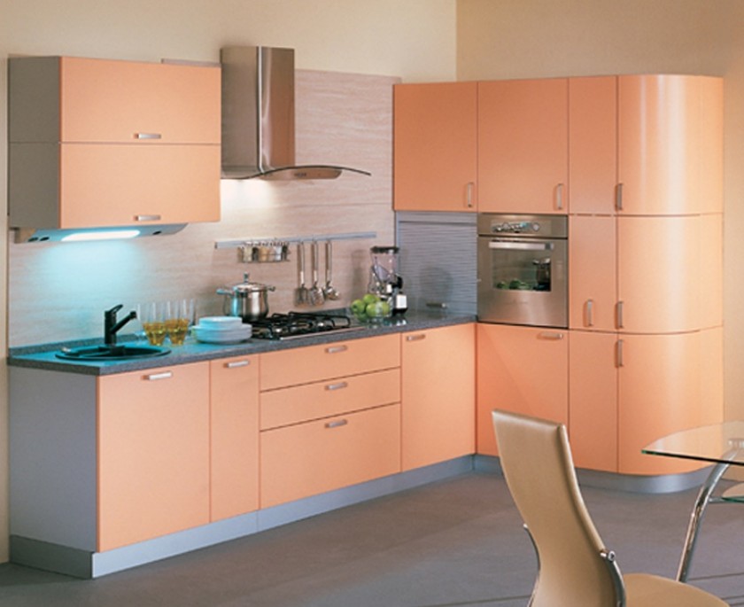 Кухня персикового цвета. Дизайн кухни с преобладанием персиковых оттенков отличается от других теплотой и некоторой нежностью, легкостью. Примечательно, что цвет является производным других довольно сильных и кричащих цветов: желтого, красного и оранжевого, которые являются достаточно сильными. А вот персиковый наоборот действует умиротворяюще. Если вы все же решили оформить свою кухню в столь нежных тонах, то должны знать, с какими оттенками сочетается персиковый. Однотонное помещение очень быстро надоест, да и выглядит такая композиция обыденно. А вот тандем с клубничным, яблочным, абрикосовым и грушевым цветами значительно украсит и преобразит помещение. Дополнительно можно даже развесить фото или изображения этих фруктов и ягод для поддержания общей стилистики.