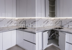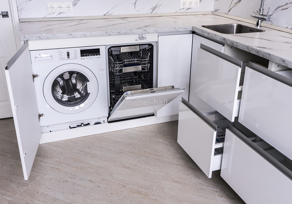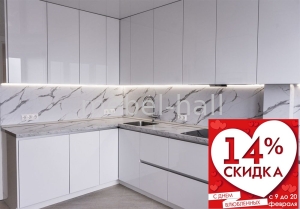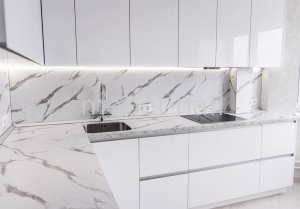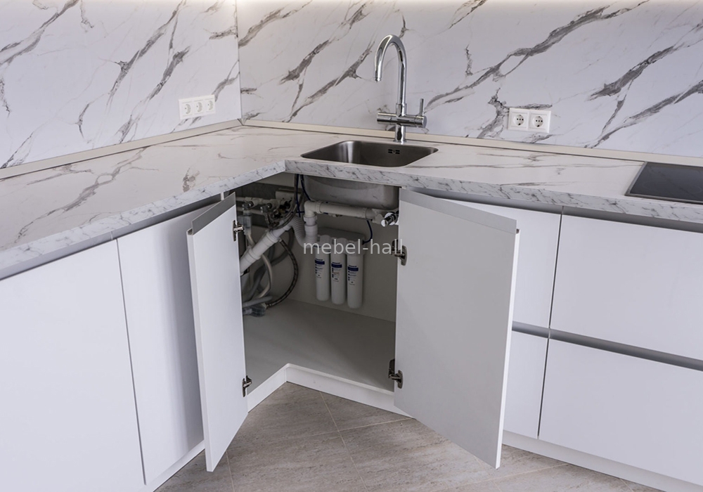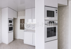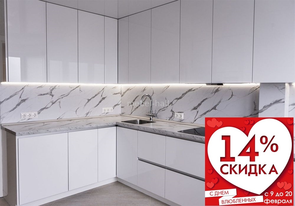 Кухня с белыми глянцевыми пластиковыми фасадами без ручек от производителя