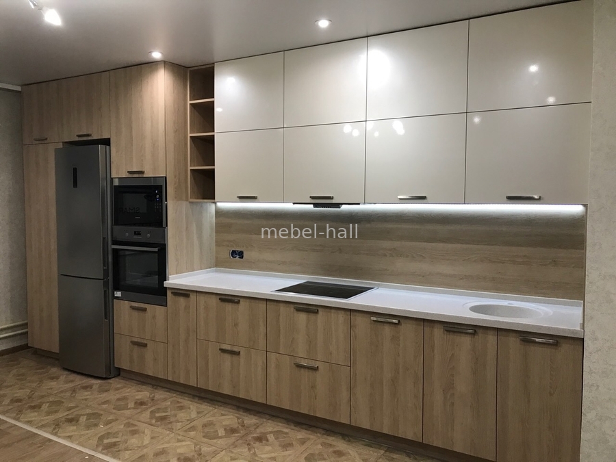 Отличие от стандартных фабричных кухонь, при индивидуальном проектировании можно предусмотреть место для любой техники и сделать шкафчики нестандартных размеров, красиво зашить колонку, газовый счетчик и котел.