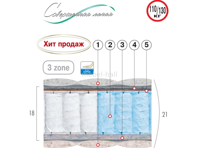 - Трехзонный независимый пружинный блок Pocket Spring разной упругости (диаметр опорного витка пружины - 63 мм; толщина - 1,8/1,9 мм; высота - 150 мм; плотность пружин от 250 шт/м2) (5)