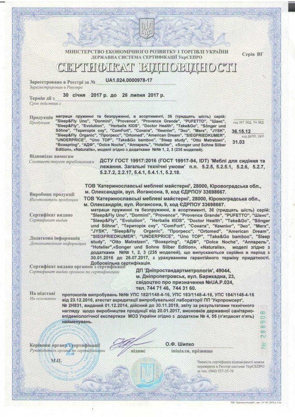 Каждый матрас Sleep Fly, и эта модель не исключение, изготовлена с использованием безопасных, экологически чистых материалов, таких как шерсть, хлопок, кокос. Матрасы бренда имеют сертификат «УкрСЕПРО» и соответствуют отечественным и международным стандартам качества и безопасности.
