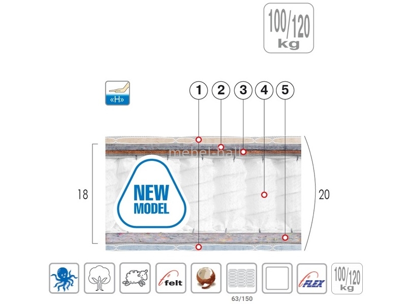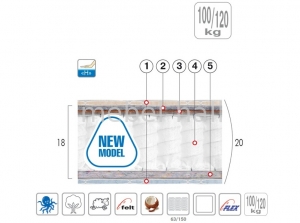 5. Thermoflex - нетканый материал из смеси восстановленных и ПЭТ волокон. Упругая объемная структура из уплотненных горизонтальных слоев волокон, сочетает одновременно стабильность и эластичность поверхности, увеличивает высоту матраца и, одновременно, распределяет нагрузку.