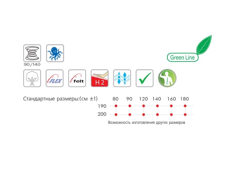 | Размер матраса, см: | 180х200, 180х190, 160х200, 160х190, 120х200, 120х190, 90х200, 90х190, 80х200, 80х190 |