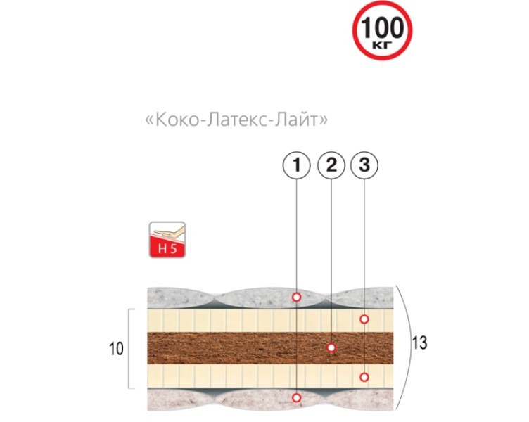 «КОКО-ЛАТЕКС-ЛАЙТ» Конструкция матраса - прекрасное сочетание характеристик современных материалов: эластичности латекса и упругой жесткости кокосовой койры. В меру упругий и эластичный, матрас обладает высокой степенью надежности. Вспененная структура качественного латекса обеспечивает прекрасную воздухопроницаемость и гигиеничность матраса. Матрас обладает безупречными анатомическими характеристиками, упругостью и стабильностью формы. Стеганый чехол матраса выполнен по типу «Зима-Лето», в наполнителе основных деталей чехла использованы волокна хлопка и шерсти.