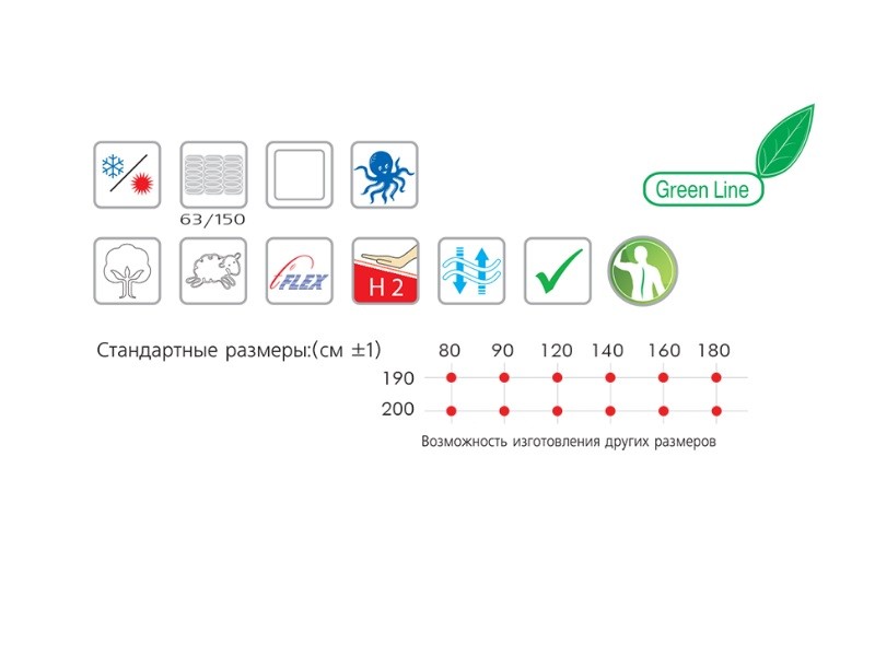 | Размер матраса, см: | 180х200, 180х190, 140х200, 140х190, 120х200, 120х190, 90х200, 90х190, 80х200, 80х190 |