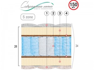 - Пятизонный независимый пружинный блок Pocket Spring разной упругости (диаметр опорного витка пружины - 63 мм; толщина - 1,8/1,9 мм; высота - 150 мм; плотность пружин от 250 шт/м2) (6)