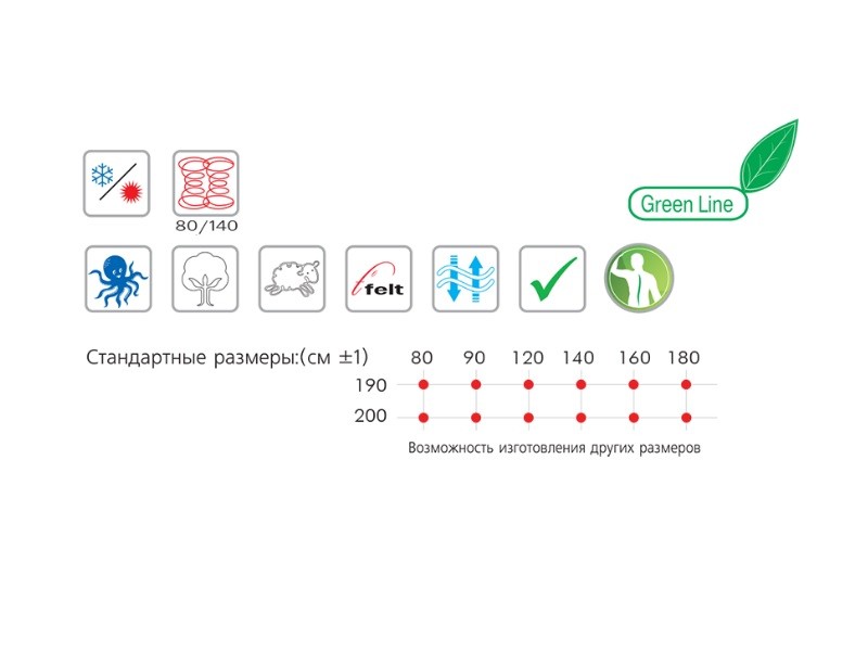 | Размер матраса, см: | 180х200, 180х190, 160х200, 160х190, 140х200, 120х200, 120х190, 90х200, 90х190, 80х200, 80х190 |