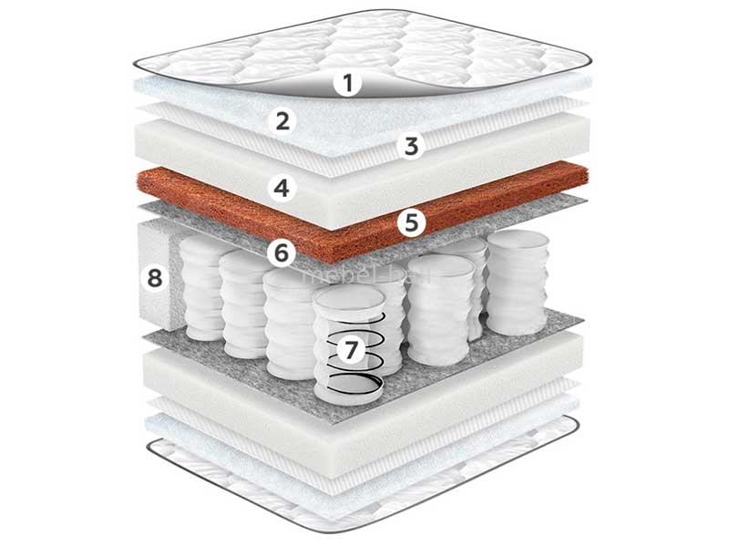 - Евроборт из пены по периметру. Борт из пены высокой плотности, установленный по периметру пружинного блока. Он предназначен для дополнительного усиления краев матраса и предупреждения их деформации. Благодаря применению евроборта вдвое увеличивается прочность и жесткость по периметру изделия, поддерживается его правильная форма. Это продлевает срок эксплуатации матраса.