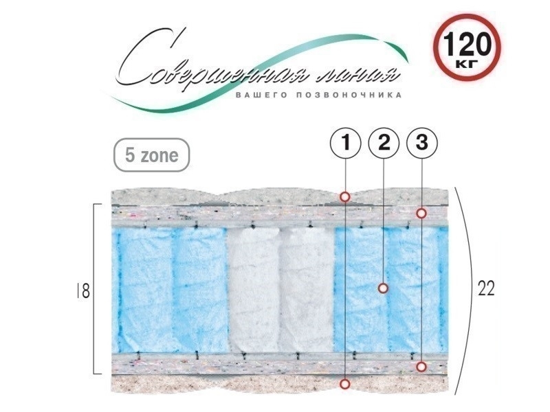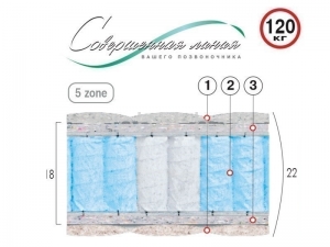 - Пяти зонный независимый пружинный блок Pocket Spring разной упругости (диаметр опорного витка пружины 63 мм; толщина 1,8/1,9 мм; высота 150 мм; плотность пружин от 250 шт/м2) (5)