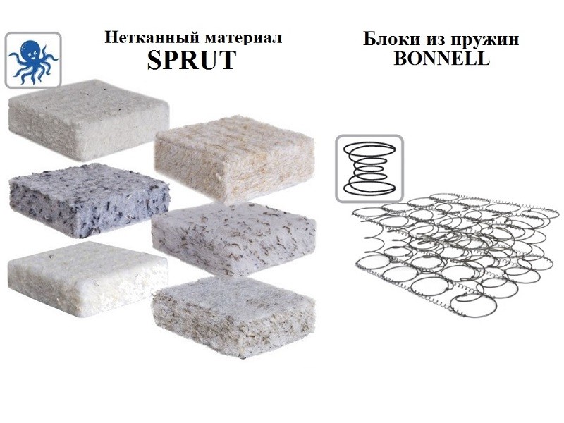 2. Sprut - объемный нетканый волокнистый настилочный материал. Отличается способностью увеличивать эффект упругости и долговечность поверхностей матраца. Технология сочетания ПЭТ волокон с волокнами хлопка, шерсти, конопли создает определяющие качества материалов для матрацев: максимальную степень воздухопроницаемости, теплогенерации и теплообмена. Материалы экологически безопасны, подвергнуты высокотемпературному воздействию.